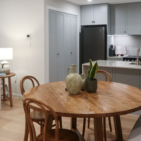 The open-plan living area is your space to unwind or connect. The seating is both inviting and stylish—perfect for lazy mornings, movie marathons, or late nights. The Sonos soundbar pairs seamlessly with the connected smart TV, or your own device, setting the stage for however you want to relax. The dining table comfortably seats six, with a mix of cushioned bench seating and elegant chairs that make it just as good for a casual lunch as it is for a long dinner.